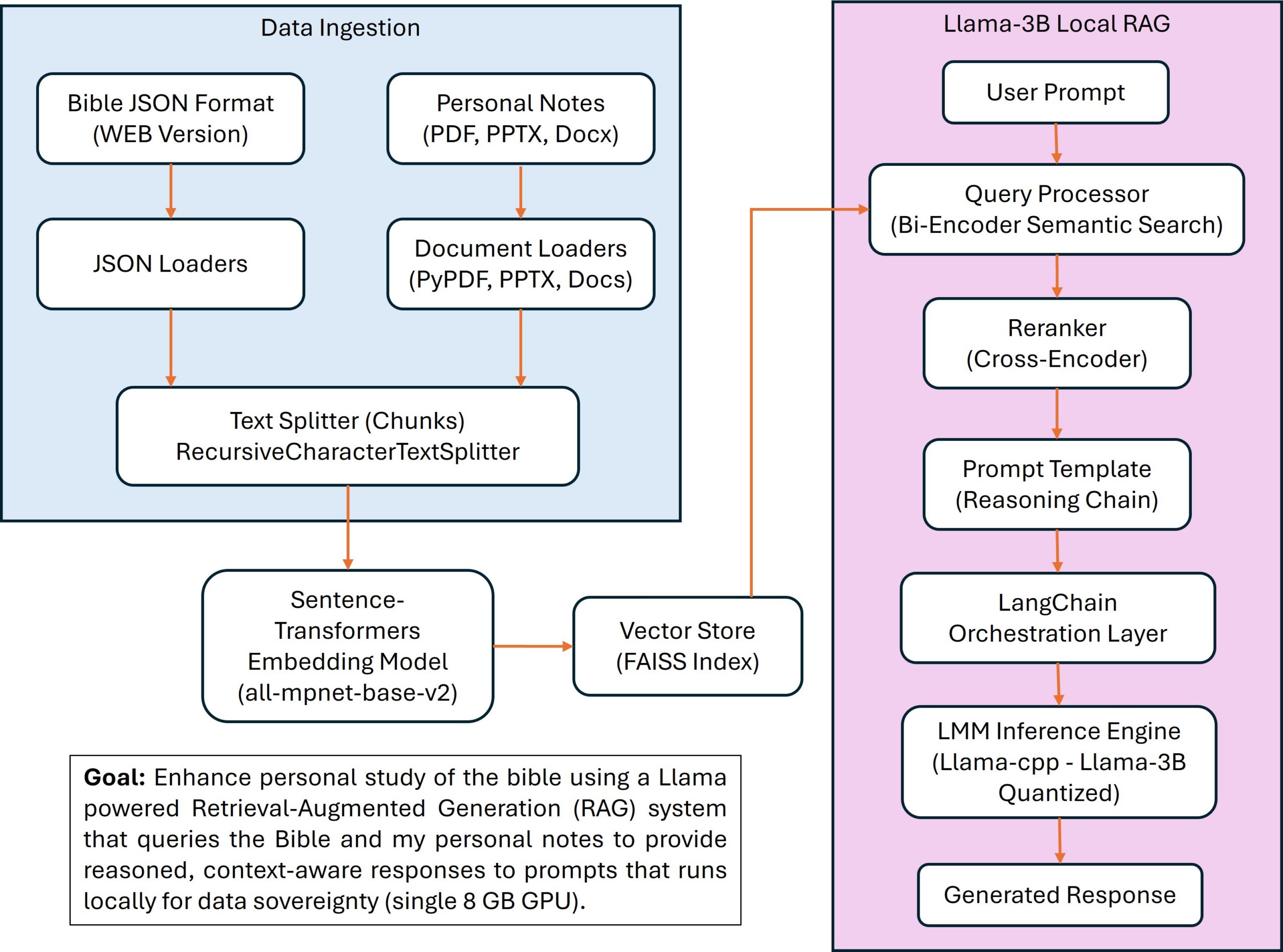 To demonstrate this AI coding workflow, I built a personalized bible and notes query system with Llama RAG. The goal is to enhance personal study of the bible using a Llama powered Retrieval-Augmented Generation (RAG) system that queries the Bible and my personal notes (in various formats) to provide reasoned, context-aware responses to prompts that runs locally for data sovereignty. The system handles fragmented, context-rich data (e.g., verse citations, theological notes) and delivers quality outputs by combining scriptural references with my insights, ensuring responses are grounded in source material while offering logical reasoning chains. Here is the resulting mark down specification.